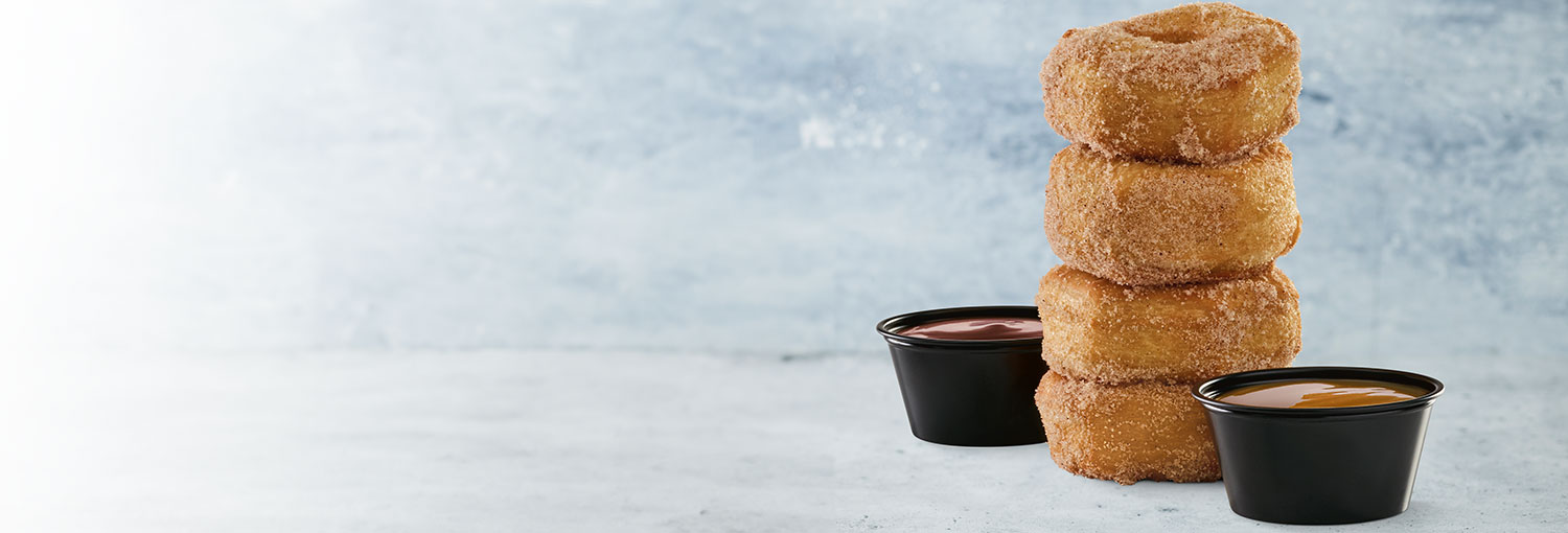 Four cinnamon and sugar croissant donut rings served with caramel and fudge.